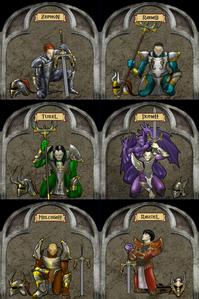 Их было шестеро - Дюма, Мелкая, Зефон, Рахаб, Турэль и Разиэль. Вот эти ребята. Забегая вперёд скажу что создал их Каин из паладинов-сарафанцев.