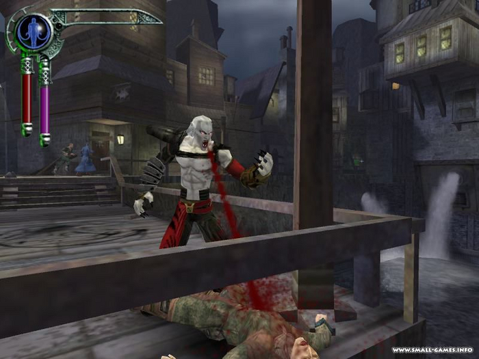 И погрузился в игру. И как же она была хороша. В данной игре мы попеременно играем за Каина и за Разиэля. Геймплей первого сосредоточен на боях, геймплей второго на акробатике и решении головоломок. Впрочем как синему придётся хорошенько помахать своим призрачным клинком, так и древнему вампиру кое где поднапрячь извилины. Теперь боевая система изменилась и напоминает Devil May Cry - у нас есть несколько ударов, телекинез, захваты и мы вольны по всякому их комбинировать. Постепенно мы находим апгрейды открывающие различные комбухи, с которыми колотить врагов становится ещё увлекательнее. Да, забегая вперёд можно сказать что по сути их приёмы практически одинаковы, но кому какая разница, особенно тогда. Пополняем здоровье мы по прежнему - Каин предпочитает пепси, а Разиэль исключительно за духовное обогащение. Причем тут тоже есть свои, радующие глаз, нюансы - если доведённый до кондиции враг стоит в отдалении, Каин высосет кровь "по старинке" телекинетически, а если близко вопьётся клыками в горло. Так же можно не хилиться, но усилить клинок - пронзая противника(Каин при этом скажет "Vae Victis!" ещё одна услада ушей фаната), тогда наш меч станет на время наносить больше дамага.