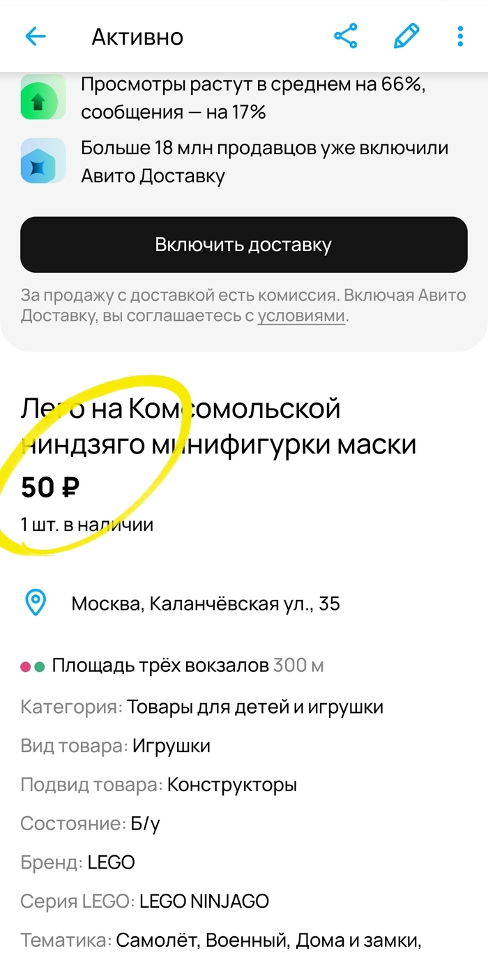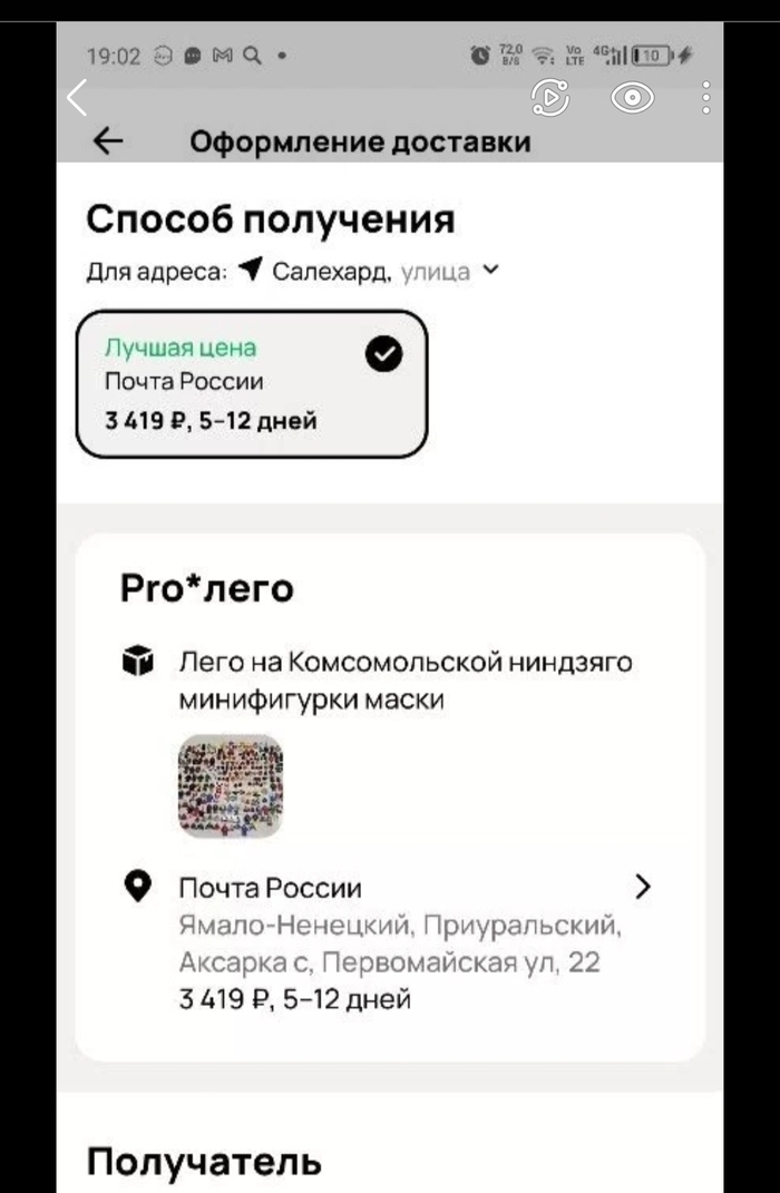 Буквально через пару часов пишет мне другой покупатель, хочет купить детали лего, ок, посчитал , договорились, спрашиваю как будем отправлять: через яндекс или через авитодоставку. Ну был выбран яндекс, доставка на минуточку за 1900 км от Москвы в Ханты-мансийский регион. Яндекс пишет стоимость доставки 209р. Мой клиент говорит, а давай я закажу автюитодоставкой , ну ок, мне то какая разница. И тут он мне снова присылает заказ почтой России и стоимость доставки с учётом стоимости моего объявления 50р [3419р], то есть доставка 3369р. Авито по моему совсем обнаглели, почта за посылку первым классом берет 314р, яндекс 209р.