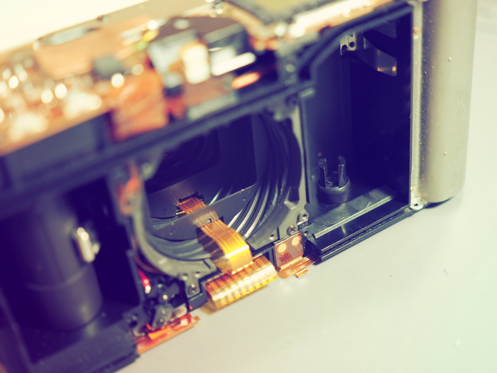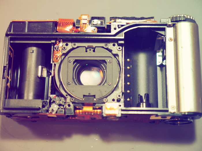Сняв корпусные части из настоящего титана можно увидеть электронный мир фотоаппарата