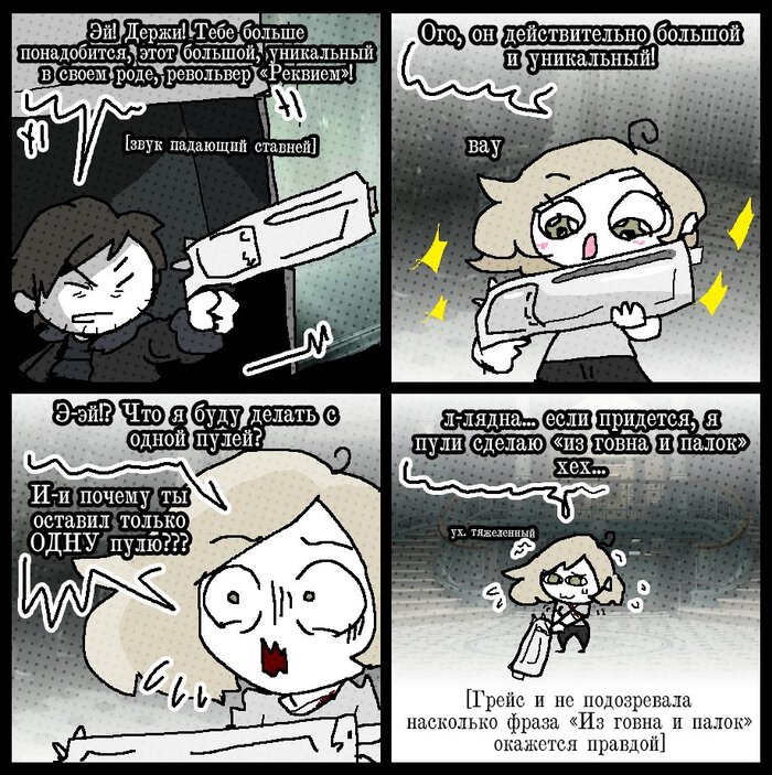 Есть возможность крафтить специальный инъектор — средство, которое окончательно добивает заражённых. Хотя Леон передаёт Грейс свой револьвер Реквием (судя по калибру и облику это российский РШ-12), патронов к нему критически мало. Это не «основное оружие», а скорее экстренный аргумент.