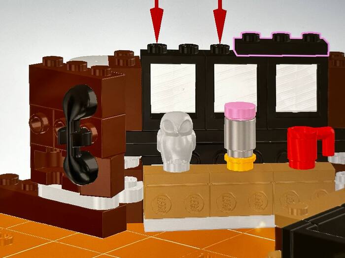 Главная функция - превращение гостинной собственно в вымпел факультета. Для этого мелкие детали (не считая минифигурок) устанавливаются на определенные места, загнутые к низу "крылья" выпрямляются, правая и левая часть захлопываются на себя. Набор готовый к трансформации выглядит так: