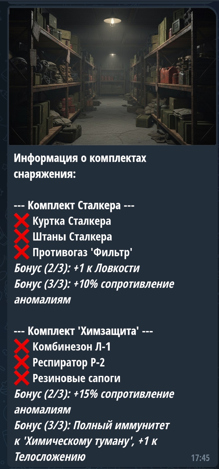 Просто крафтить новую броню — это не цель. Цель — собрать комплект. Я ввел в игру систему сетов: "Комплект Сталкера" для ловких исследователей и "Комплект Химзащиты" для вылазок в самые токсичные уголки.