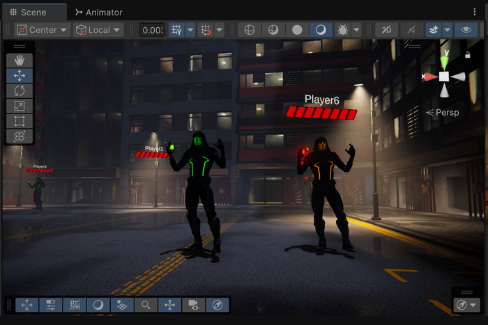 На данный момент для различия персонажей, у них сделаны разноцветные светящиеся элементы, в тон способностям.