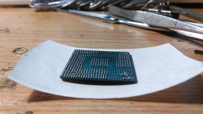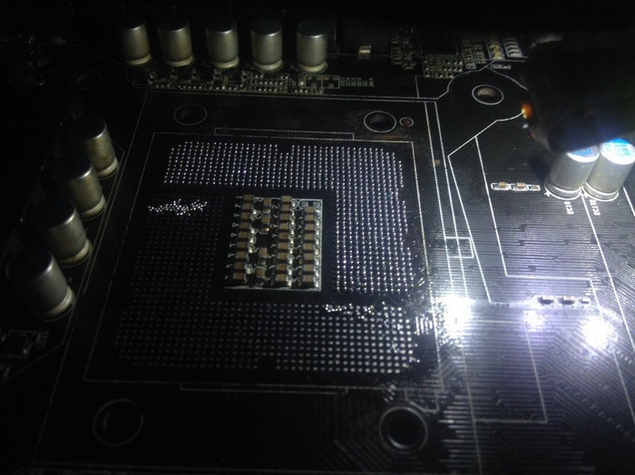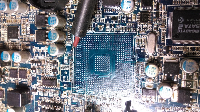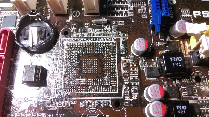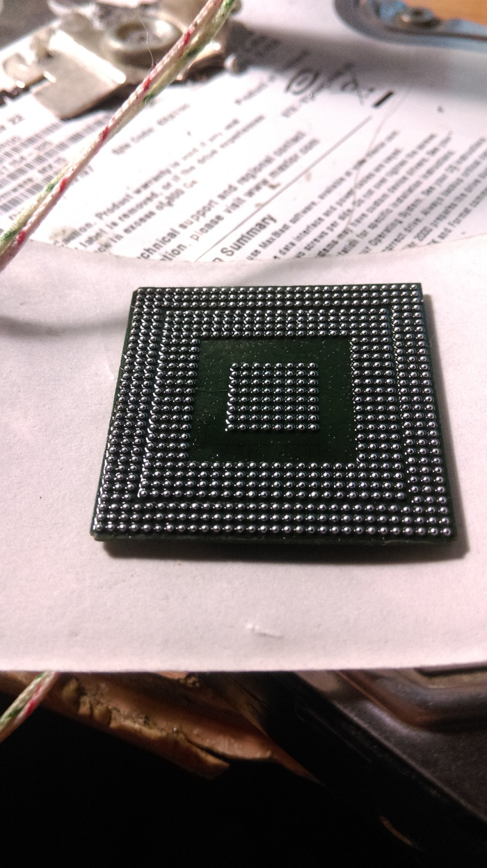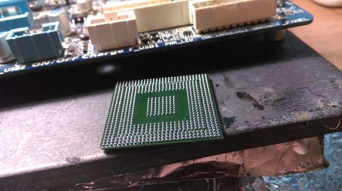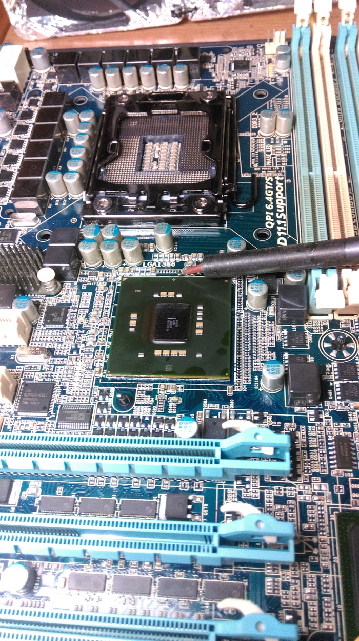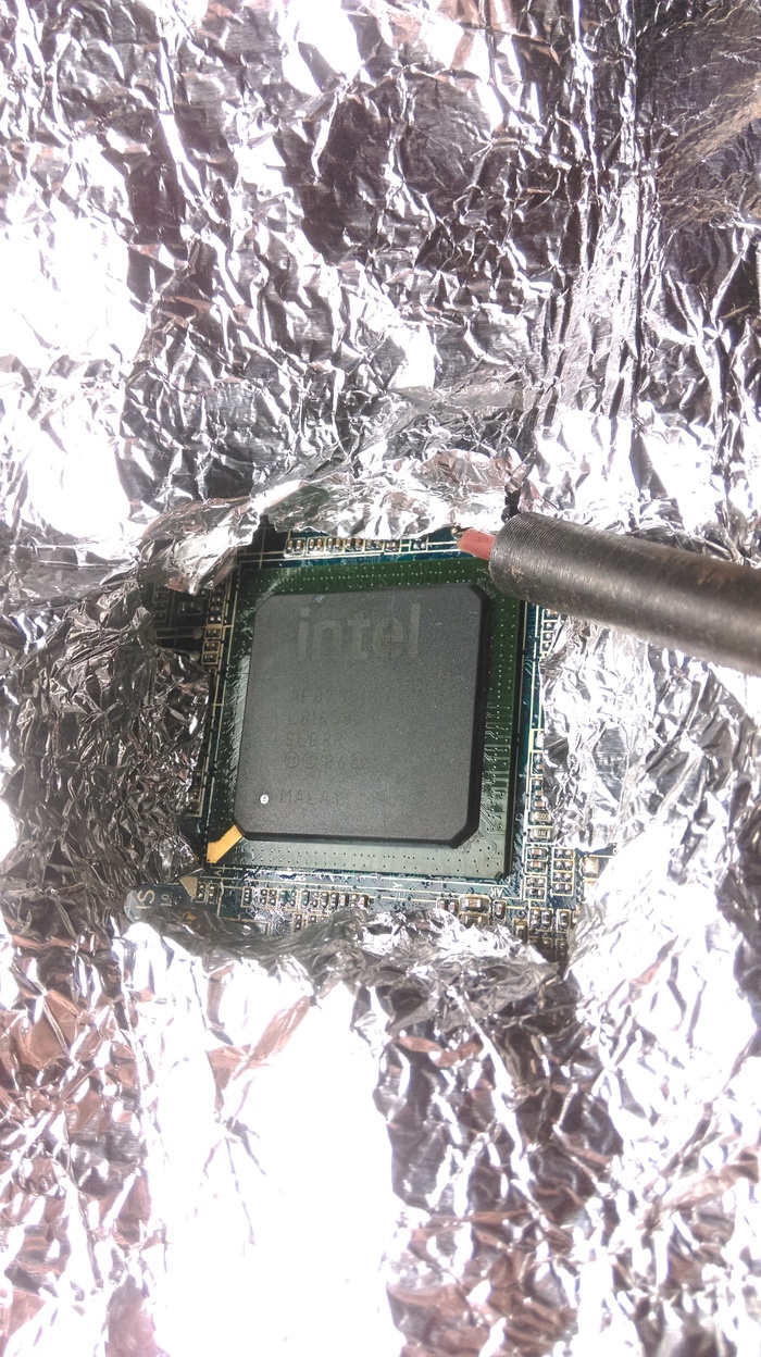 Дальше нужно полагаться только на свой опыт и исходя из него я предположил что неисправен северный мост. Для проверки своего предположения я его слегка погрел - и пару раз получил нормальный старт пока мост был тёплым. Чудеса, как же так, ведь микросхемы intel не ведутся на прогрев! Бывает что ведутся и работают пока горячие. Но это довольно редкий и индивидуальный случай.