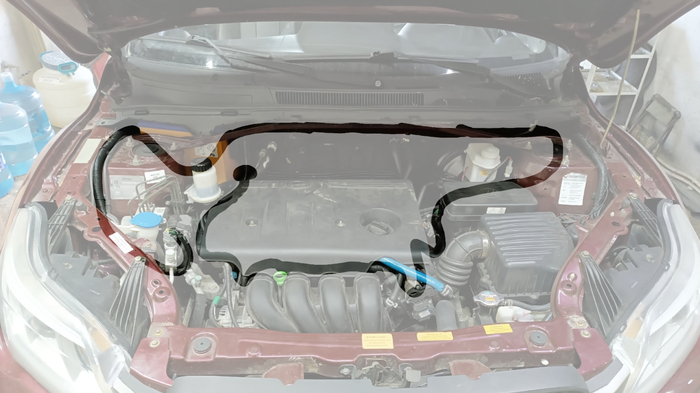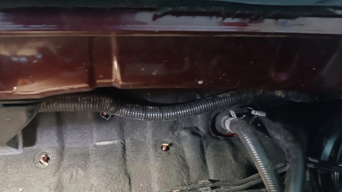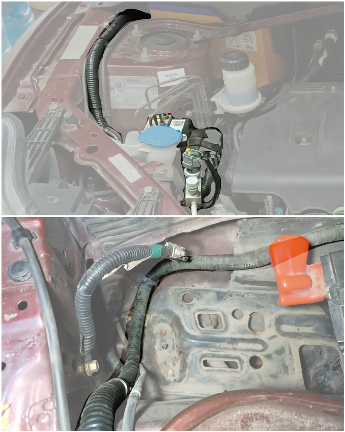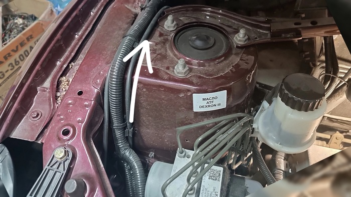 Вопреки моим ожиданиям, никаких переплетений и соединений за аккумулятором не оказалось. Коса просто идёт дальше по моторному щиту к стакану с противоположной стороны.