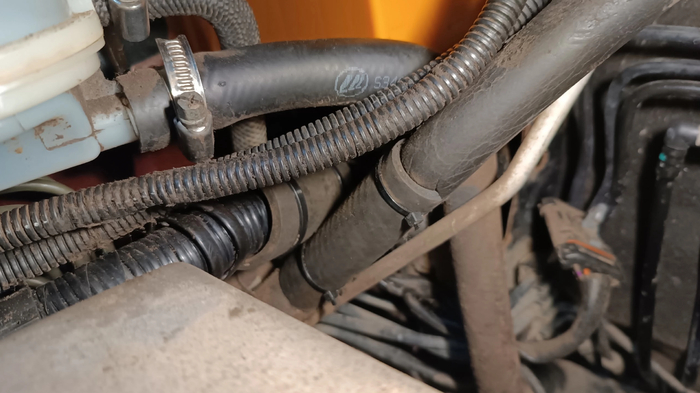 Закатываем жгут в изоленту, гофру и на всякий случай в обрезок толстого патрубка охлаждения, сделав тоже самое и с трубкой кондиционера. Вообще жгут больше не должен вывалится из кронштейнов, но мало ли.