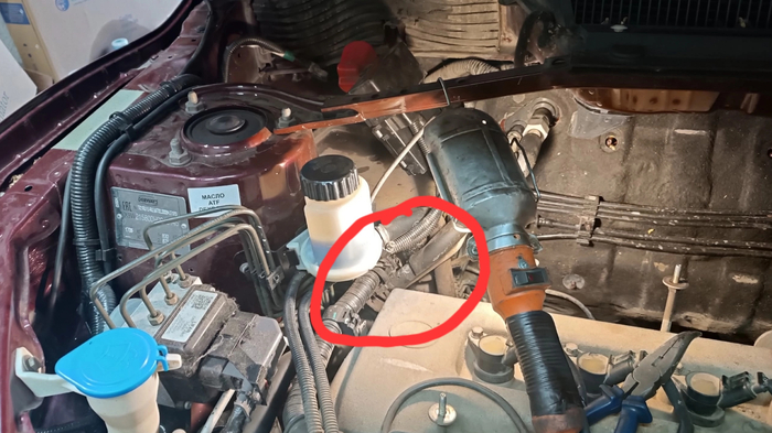 За левым стаканом она разворачивается, и проходя под главным тормозным цилиндром, поворачивает в подкапотный блок реле и предохранителей, расположенный рядом. Перед входом в блок, имеется ответвление на косу электропроводки двигателя. Оно то нас и интересует.