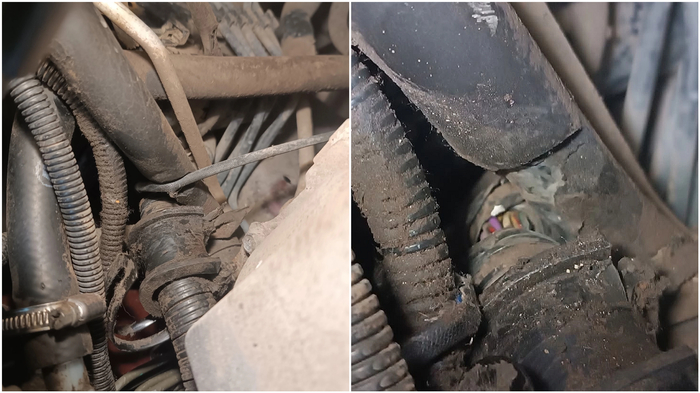 В этом месте жгут электропроводки лёг на трубку кондиционера и при колебаниях двигателя, тёрся об неё.