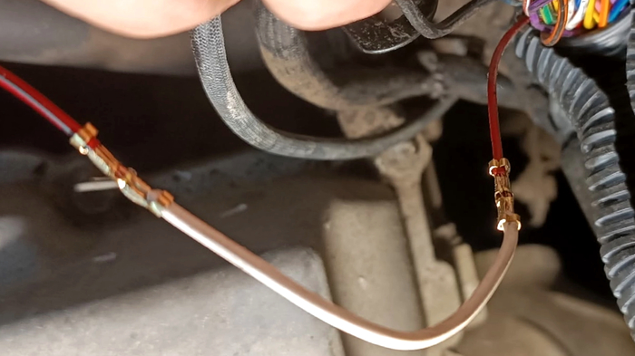 Вот наш серо-чёрный провод, который после разъёма меняет цвет на красно-зелёный, как и было в схеме электропроводки.