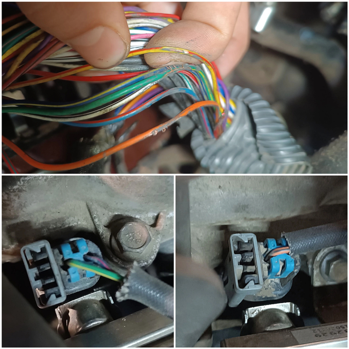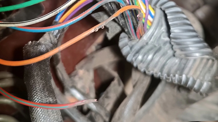 В самом жгуте проводки была протёрта изоляция у трёх проводов: зелёно-жёлтого, жёлто-красного и оранжево-чёрного. Эти провода замыкали на трубку, которая является массой. Совершенно случайно среди них оказались провода первой и четвёртой форсунок.