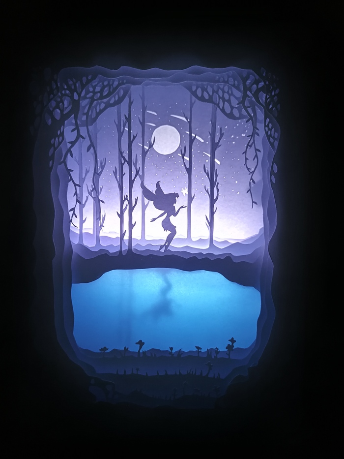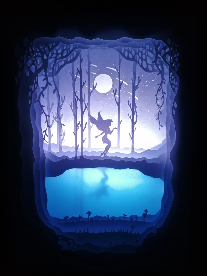Это многослойная картина, сделанная из бумаги с диодной подсветкой. За рубежом это "обзывается" холодным словом lightbox. Очень популярно в азиатских странах. Сам боксик сделан из натурального дерева, покрыт слоем лака. При желании можно покрасить под свой интерьер. Предусмотрена конструкция для подвеса на стену. Питание от трёх батареек АА, спрятанных внутри корпуса. По желанию можно сделать от usb устройства (зарядка, ПК). Каждая работа сделана с добротой и любовью. В каждой частичка души. Покрыт лаком, пыль грязь не страшны. Батарейки легко меняются.