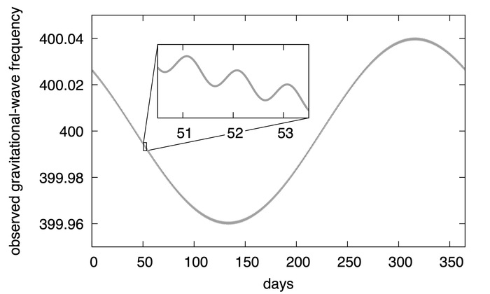 Сила эффекта Доплера зависит от времени (в течение суток и в течение года) и от положения нейтронной звезды на небе. На графике справа показано моделирование непрерывного гравитационно-волнового сигнала, получаемого на Земле. Вы можете наблюдать годовую и суточную модуляции эффекта Доплера.