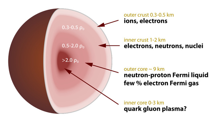 Нейтронные звезды - компактные и экзотические объекты. Их диаметр составляет от 20 до 30 километров, что примерно равно размеру небольшого города. В то же время их масса в среднем равна массе полумиллиона планет Земли, или в 1,4 раза больше массы нашего Солнца. Эти объекты состоят из вещества, которое намного плотнее, чем обычное вещество в любой точке Вселенной. Плотность нейтронной звезды сравнима с плотностью атомного ядра (а внутри, возможно, даже выше). Нейтронные звезды обладают сильными магнитными полями, в триллион раз сильнее, чем магнит на холодильнике. Некоторые из них также вращаются вокруг своей оси со скоростью до сотен оборотов в секунду. На рисунке справа показана внутренняя структура нейтронной звезды.