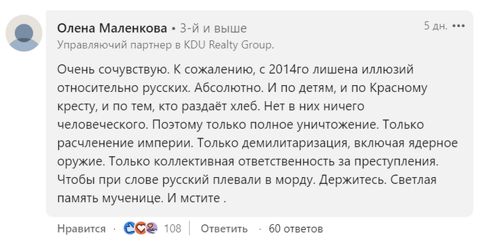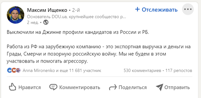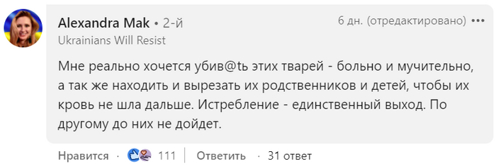 Я часто пользую данной сетью для поиска работы как и многие люди, я сам имею украинские корни, у меня фамилия украинская, моя бабушка родилась в Одессе, а дедушка на половину украинец, меня самого вся эта война не устраивает, но подобные высказывания фактически поддерживаются данной сетью при их бездействии.