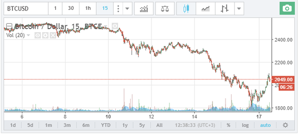 На биржах в это время все обложились кирпичами и курс несколько дней до этого подрос. Сразу после решения вопроса о возможном дефолте США курс биткоина вернулся на круги своя.