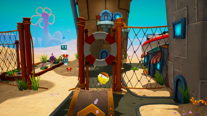 Да, вы бегаете по локациям, разбираете в основном несложные головоломки и попутно уничтожаете сотнями милых роботов, которые только и делают, что защищаются. Однако вам не сразу доступны все локации и способности. Для Открытия новых локаций вам нужно больше могущества. А сила Губки Боба в чем? Правильно. В волшебных золотых лопатках.