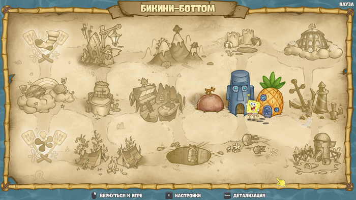Вам мало тайн? Хотите окунуться полностью и коснуться кончиками пальцев “дна правды”? Тогда перед тем, как отправиться в логово финального босса, вам нужно собрать все возможные лопатки в игре, а их, если я правильно помню 98-99. Я собрал к моменту прохождения 76 лопаток, не выполнив только пару-тройку договоров и испугавшись снов Губки Боба.
