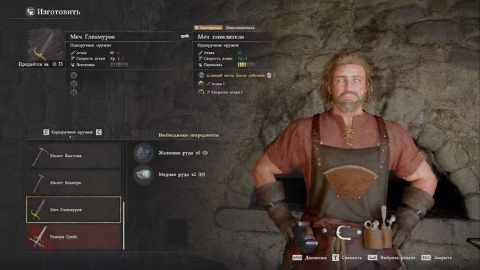 Поэтому займёмся кузнечным делом и алхимией. Хотя признаюсь, что одного из первых сюжетных боссов я зарашил в лоб обжираясь похлёбкой. Просить исправить это разработчиков я не буду, так как каждый должен сам выбирать как ему удобнее/приятнее играть. Но это лирика, идём к кузнецу.