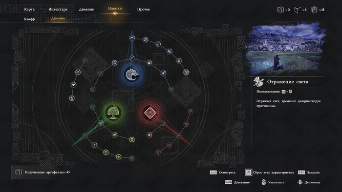 В целом дерево умений позволяет выучить почти всё и вся, главное заработать или найти достаточное количество ресурсов. Но почти, потому что некоторые способности вы можете выучить лишь в определённых условиях. Например, наблюдая за атаками противника и изучая их. Также часть умений открывается артефактами для слотов в оружии/доспехах. Например, мне очень нравится меч, который позволяет натравливать ворон на врагов после завершения действия/комбо.