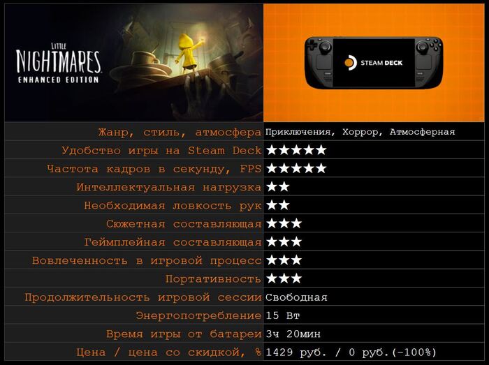 Little Nightmares – для прохождения этой игры придётся освоить управление из одного левого стика, 3х кнопок ‘A’, ‘B’, ‘X’ и двух триггеров ‘L2’ и ‘R2’. Переживать не стоит, максимум – это движение стиком + разбег ‘X’, потом прыжок ‘A’ и зацеп ‘R2’. Остальные действия выполняются последовательно и не требуют спешки. Правый стик позволяет осматриваться вокруг. Цена ошибки не высока, персонаж откатывается не далеко, очнулся и повторяй пока не получится. Портативность игры лучше предыдущей, можно играть без зарядки более 3х часов. Если верить SteamDB, то когда-то игру отдавали бесплатно.