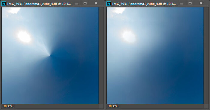 2. Видно, что необходимо избавиться от конуса на небе (фрагмент IMG_3931 Panorama1_cube_4.tif). Каждый решает сам, как и что будет делать. Я его размазал с помощью микс-кисти.