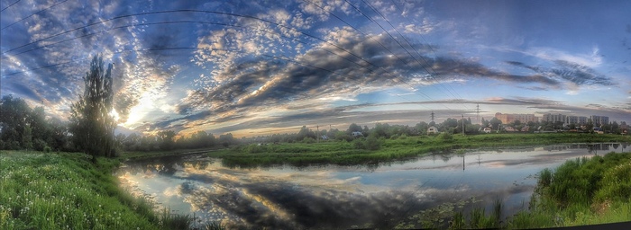 Данная панорама была снята с рук без особой надежды на результат, больше из интереса. Здесь я сделал 57 снимков с избыточностью по небу и по земле, чтобы хоть что-то получилось, потому что при более ранних попытках этих снимков мне как раз и не хватало, поэтому небо и землю приходилось достраивать вручную. Забегая вперед, скажу, что несколько снимков земли из проекта я исключил. Вот, где мне совсем не помешала бы панорамная головка, которой тогда еще у меня не было.