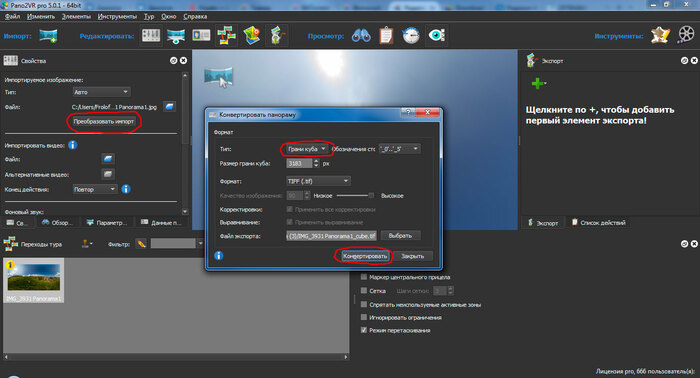 4. Конуса как раньше больше нет, поэтому панораму можно собирать обратно. Снова нажимаем Преобразовать импорт, но теперь выбираем Тип - Эквидистантная, указываем ширину исходного изображения и снова нажимаем Конвертировать.