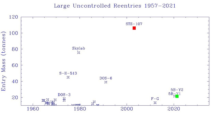 Самым крупным и самым известным инцидентом был сход в 1979 г 76-тонной станции Skylab, в результате неконтролируемого входа в атмосферу обломки были разбросаны по Индийскому океану и Западной Австралии.