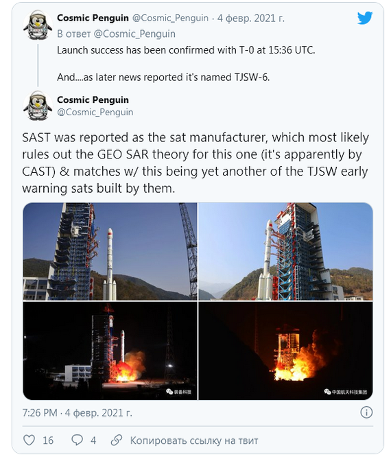 Напомним, что в январе 2020 года ракета Long March 3B стартовала со спутником TJSW-5.