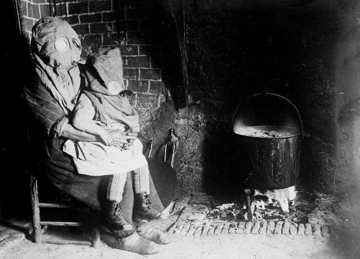 Мать с ребёнком в убежище в противогазах. Франция, 1916 год.