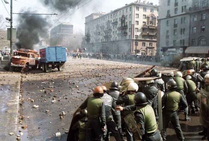 Cтopoнники оппозиции на первomaйской дemoнстрации забpacывают камнями ОМОНовцев. Mocква, 1993 год.