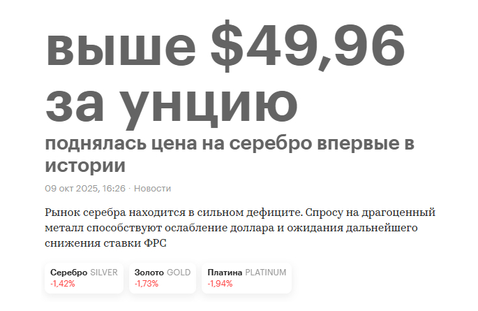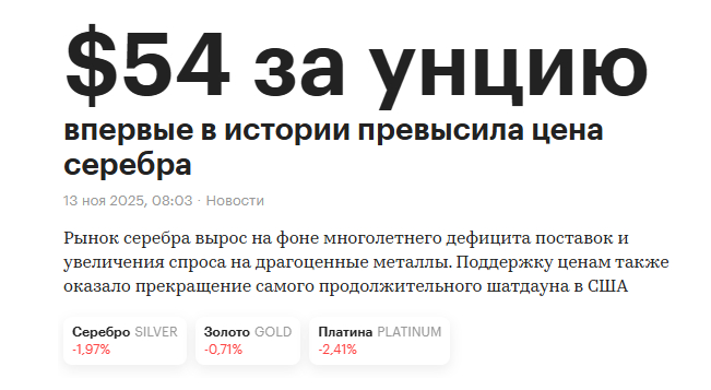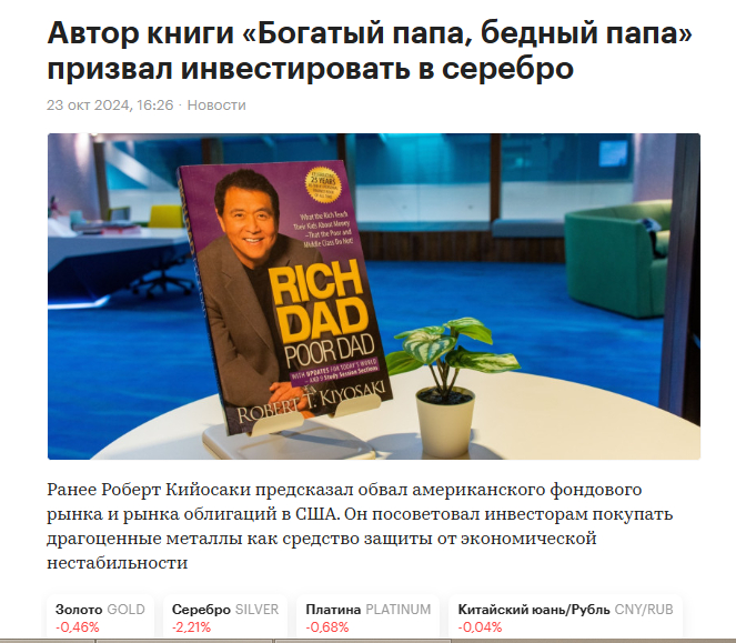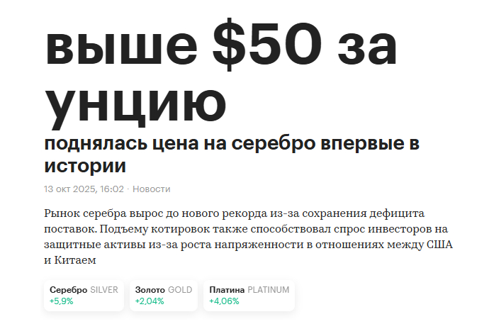 Вывод дедули. Мы находимся в самом начале «Перезагрузки». Сначала серебро и платина должны вернуться к историческим соотношениям с золотом (это 1 к 15 по серебру и по платине 1 к 1), а затем возможна девальвация фиатных валют к золоту. У нас фиата подчеркиваем это практически нет, Биржевик вас засадил в юань, по щас сидит в лонгах и ждет роста, у нас фиата нет. Инвестиционно у нас серебро и золото лежит в физическом виде, мы никуда его не продаем. В электронном виде золото мы покупаем и наращиваем его только как денежную подушку, краткосрочный кэш, о чем мы с вами говорили в прошлом ролике. Как только наступит коррекция, такую как мы видели в апреле прошлого года, на тарифной панике, вот эта подушка у нас пойдет в ход, и мы закупимся подешевевшими активами, скорее всего частью средств зайдем в иностранные активы через фридом финанс, пока присматриваемся, что будем покупать, на хаях ничего покупать не будем, нет смысла, копим бабки в золоте и спокойно сидим.