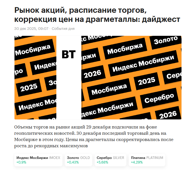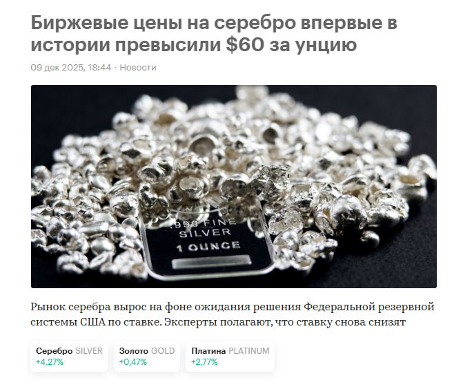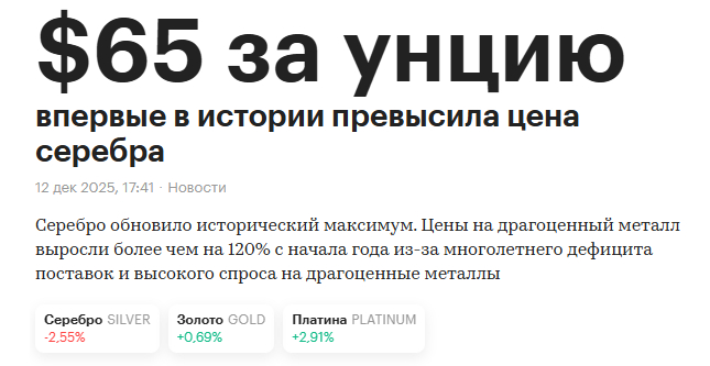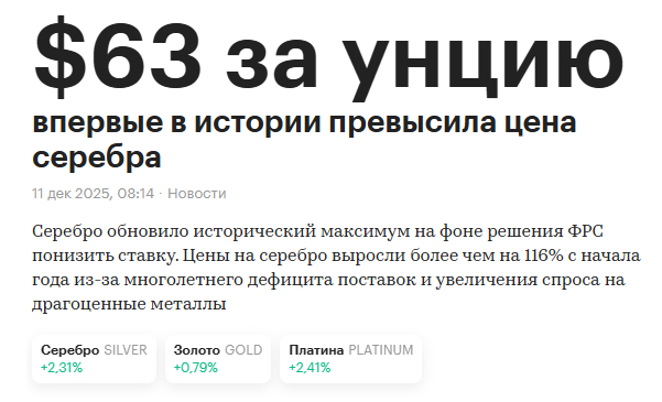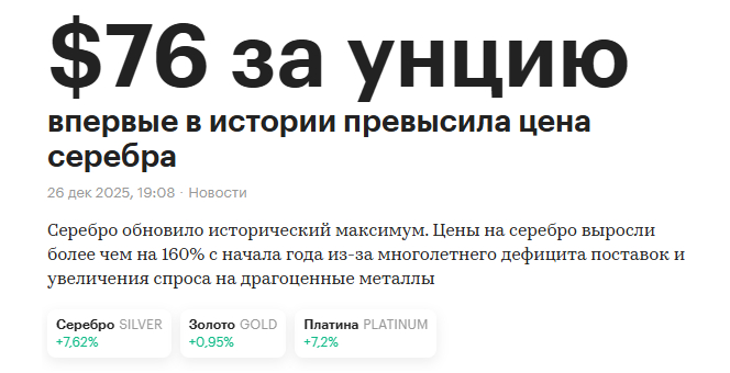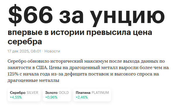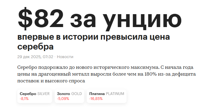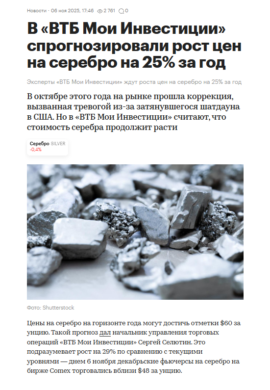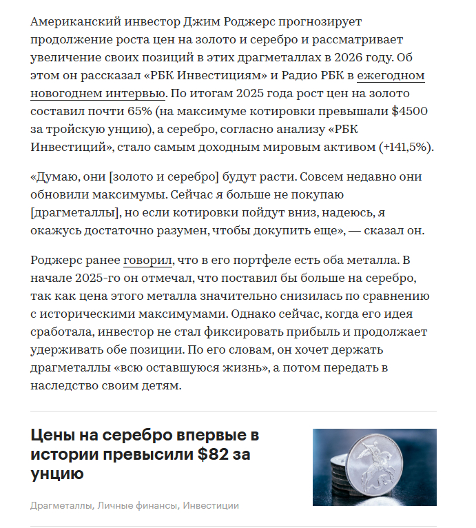 У нас аналитика прямо противоположная, мы с вами ждем роста, в лучшем случае колосального роста драгоценных металлов и всего рынка сырья в 2026 году. Инвестиционные позиции в физическом металле держим, краткосрочные позиции в электронном виде в золоте также держим и наращиваем, ждем коррекции на которой мы с вами будем закупаться, никакого фиата у нас нет. Серебряная битва с Биржевиком продолжается, статьи писать продолжим, все это будем публиковать по мере поступления свежих данных и аналитики в нашем Тг канале.