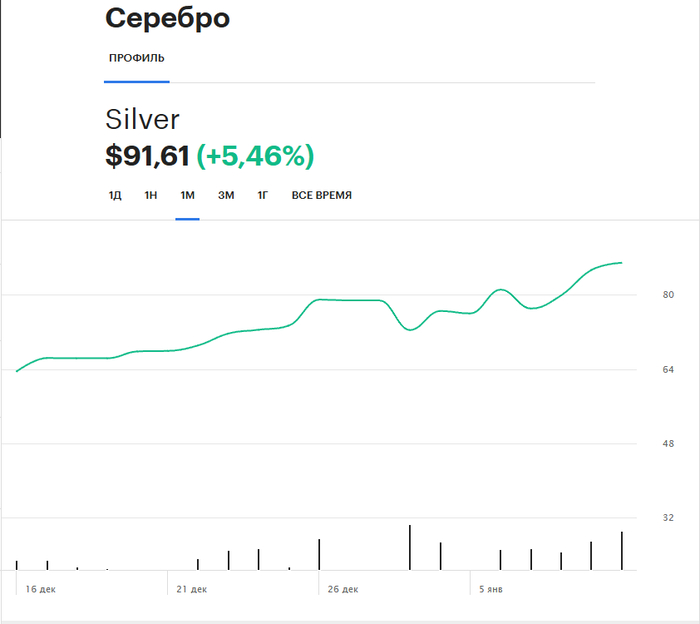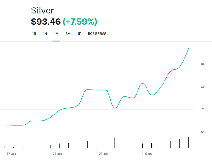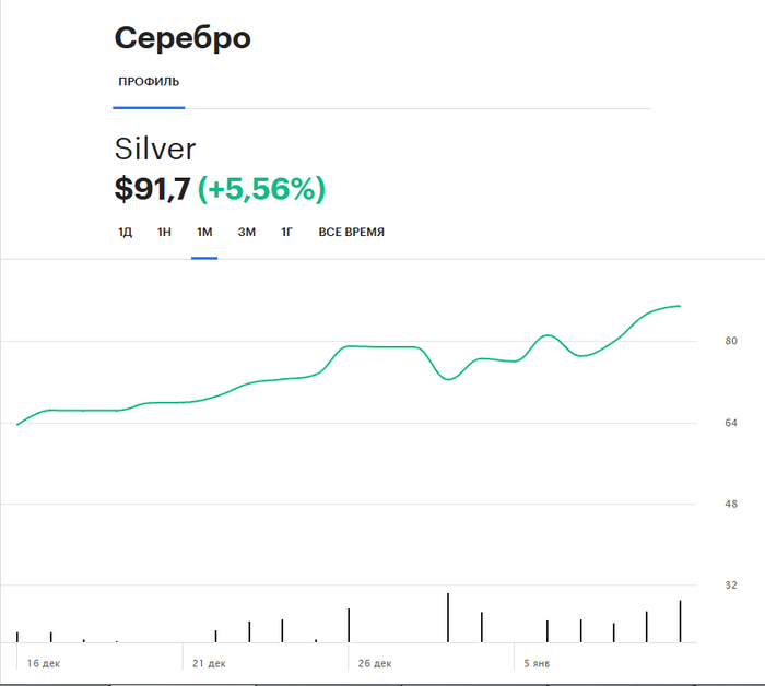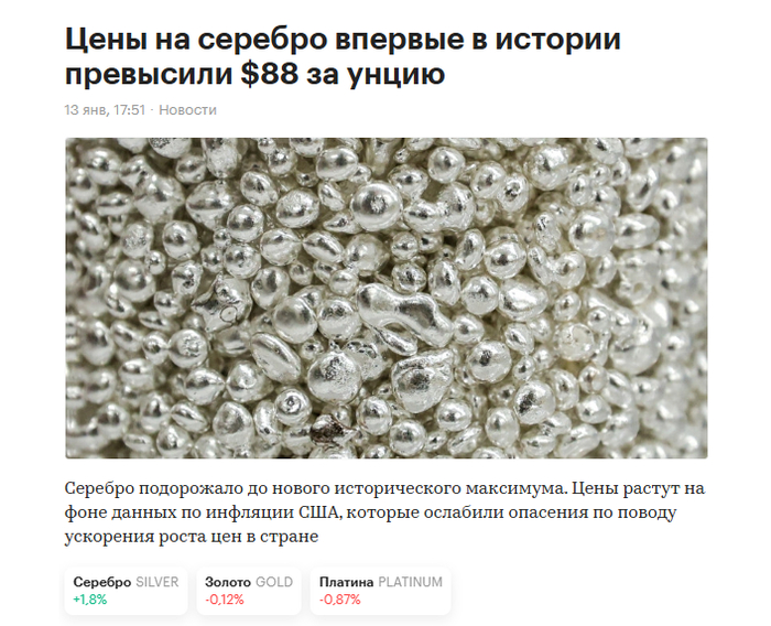 То есть с 2050 до 2360, золото выросло всего на 15%, шляпа уже не выдержал, его отмаржинколили и он все закрыл. Убытки он свои не признал, он заявил, что сделал перекладку в опционы и там тоже все погорело. Смотрим на серебро, 1 декабря, когда Биржевик его собирался шортить оно стоило 58 долларов за унцию. На пике оно доходило до 80, щас выше 75. С 58 до 80 – это рост в 38%, почти 40%. Ну и как вы думаете, отмаржинколили по итогу Биржевика? Шляпа не выдержал маржинкола и все закрыл при росте золота всего на 15 процентов. Биржевика в моменте везли на 40% и продолжают это делать. Ответ напишите в комментариях, что вы думаете по этому поводу.