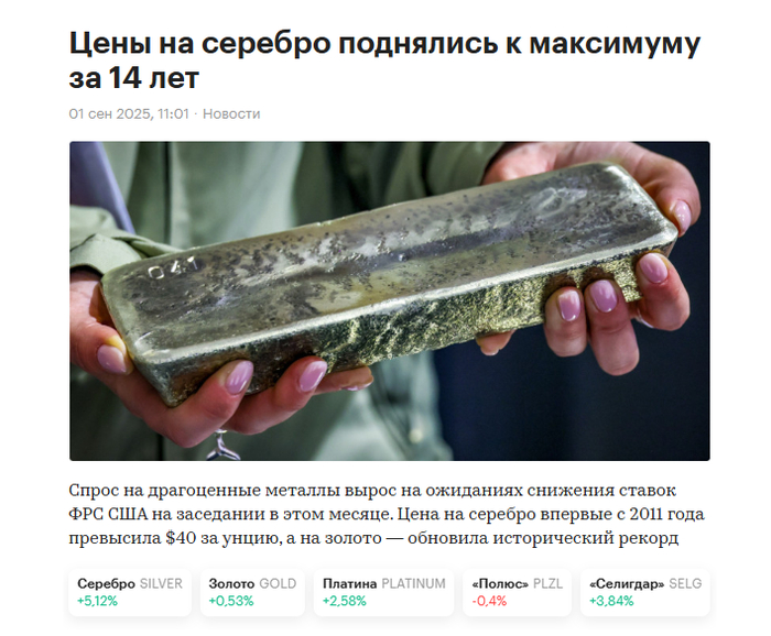 Плюс мы с вами публиковали целый ролик, посвященный этим событиям, и в июле еще, тот аналитик на которого мы с вами ориентируемся уже год нас предупреждает, что в серебре грядет масштабный и громадный шорт-сквиз. Биржевик при этом копил серебро в слитках и продал свою позицию в районе чуть выше 30 долларов за унцию, мы с вами по этим ценам даже ниже наоборот закупались, это первый момент. То есть Биржевик продавал, мы покупали. Его же зритель в сердцах накатал целую оду Биржевику, по поводу его провала, то есть Биржевик пропустил весь рост.