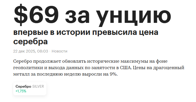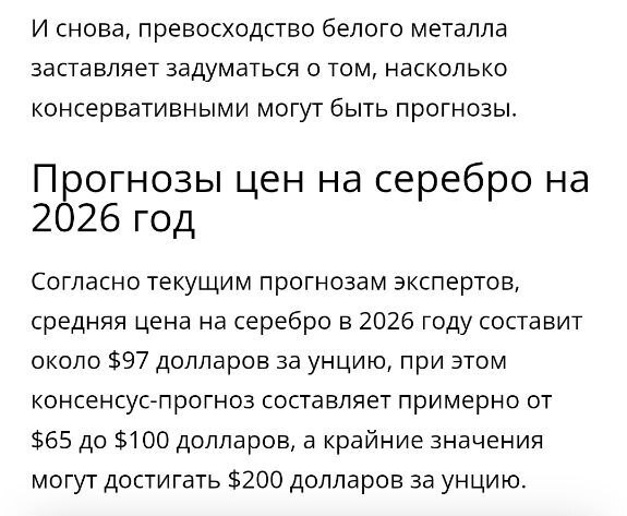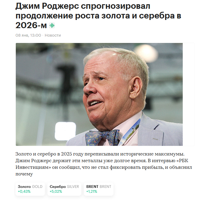 По выводам дедули, независимо от того, как изменится цена на золото в течение следующих шести месяцев, ожидается, что рост цен на серебро будет гораздо более впечатляющим. Многих удивят максимумы, которых может достичь этот металл в 2026 году. Вот и вся аналитика, год она нас не подводила, дед посвятил всю жизнь изучению рынков драгоценных металлов, мы полностью ему доверяем и полагаемся на его аналитику. Биржевик фундаментал вообще не смотрит, он торгует по ема 200, ема 300, перегретым арсиайам и полосам Боллинджера, если график перешел за верхнюю полосу Боллинджера, а арсиай перегрелся, заходим в шорт. Совершенно очевидно, что этот подход, который пропагандирует Биржевик с треском провалился и развалился.