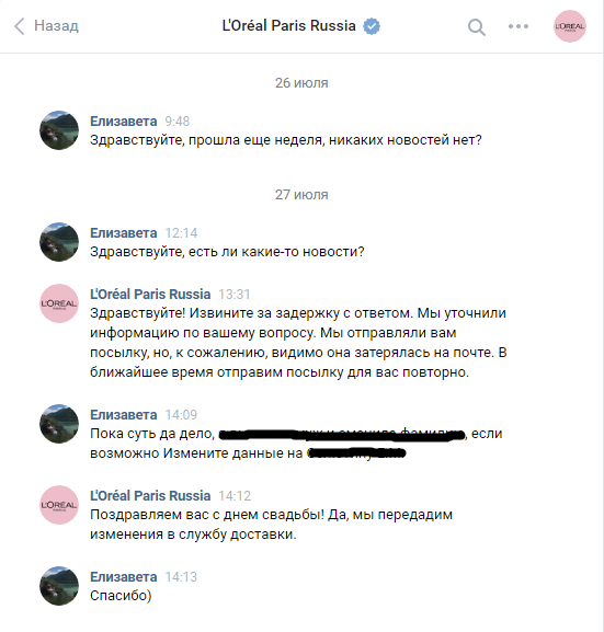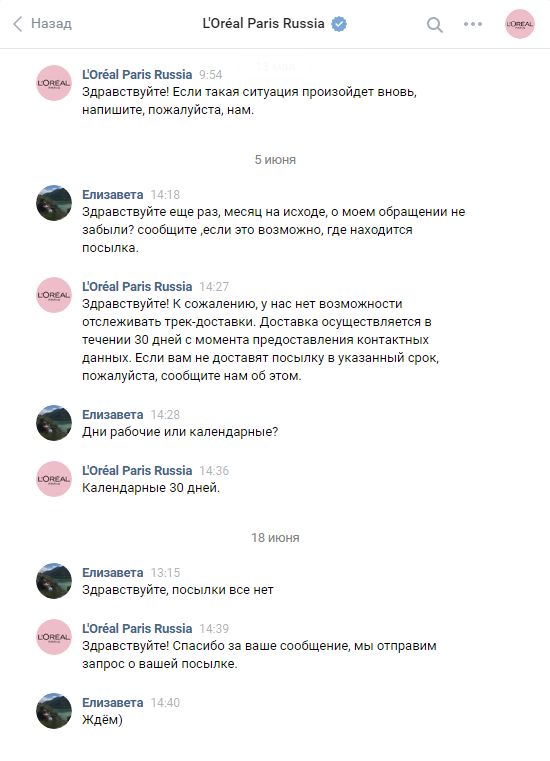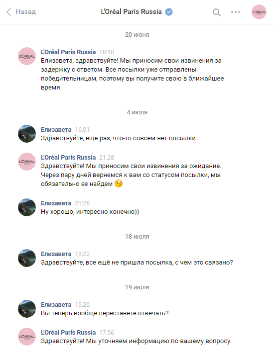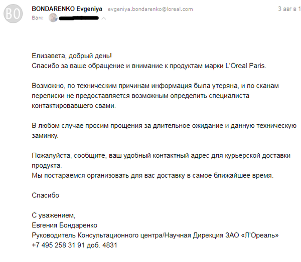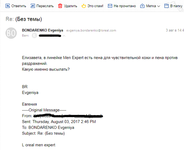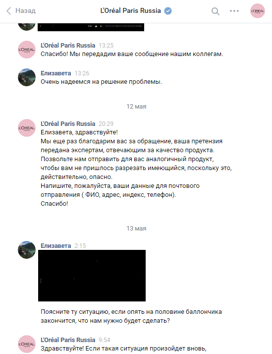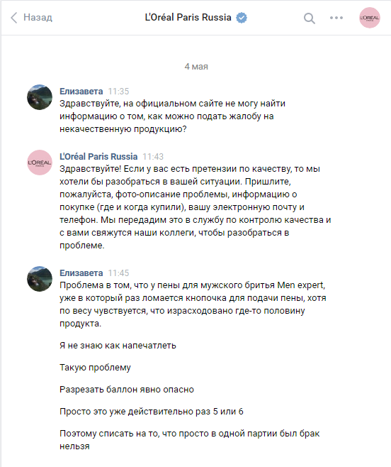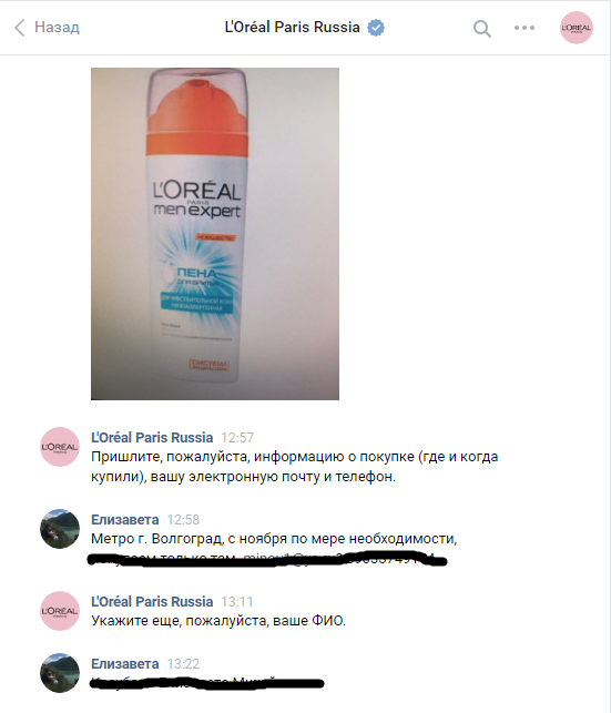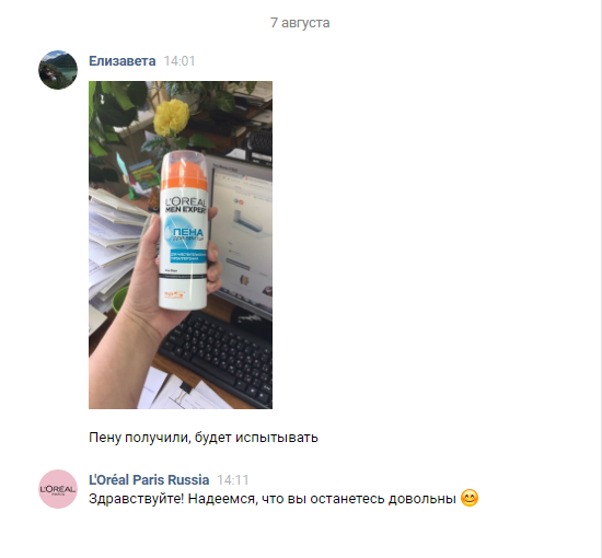 Мой муж пользуется пеной для бритья определенной марки уже долгое время, и каждый раз у нее ломался дозатор, хотя внутри, если потрясти баллончик, оставалось еще дофига. Я решила написать об этой проблеме в компанию Лореаль. Сначала я обратилась просто в группу в вк, и мы очень долго переписывались, часто не сразу отвечали и говорили, что все ок ждите...Мне это поднадоело и я написала на loreal.russia@loreal.com жалобу о том, что меня кормят завтраками специалисты из вк. Там реакция оказалась немного быстрее)