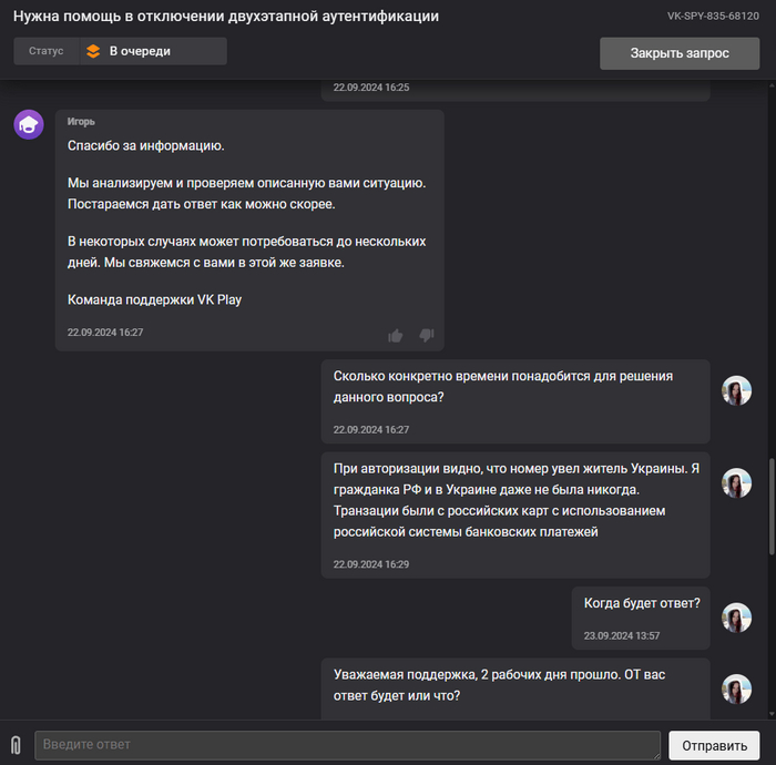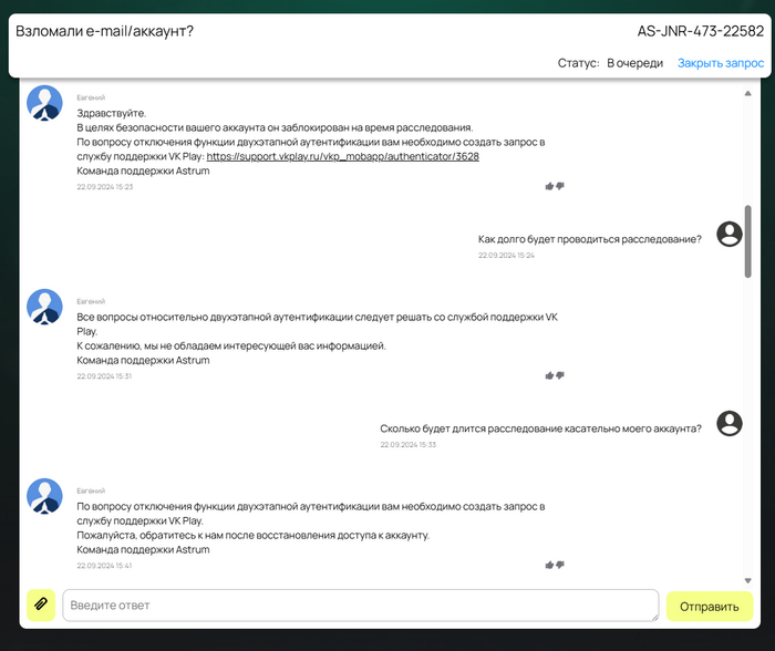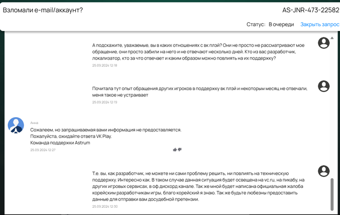 Далее пишу в поддержку VK Play. И вот тут ВК показывают себя по всей красе)