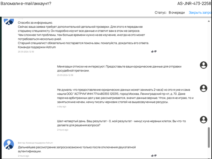 Меня такой перфоманс не очень устраивает и я решила еще раз написать аструмам, ведь 2 компании, ведущие один проект, должны как-то взаимодействовать между собой? Нет. Им насрать на вас, у них тоже лапки. Даже старший специалист не смог справиться с такой непосильной задачей.