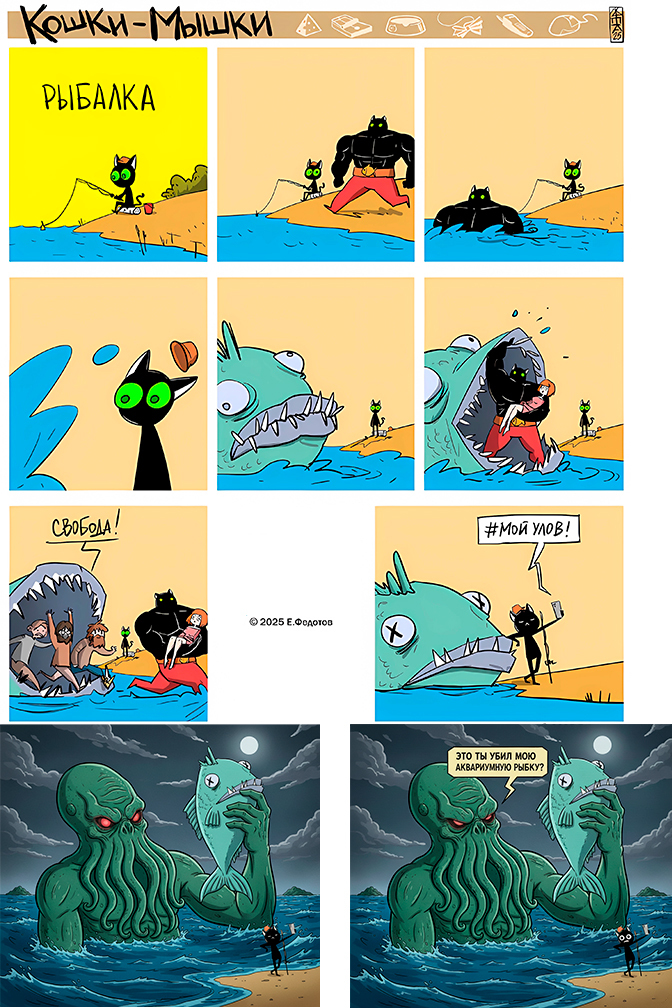 Кошки-мышки (комикс) Кот Комиксы Юмор Рыбалка Арты нейросетей Ктулху Говард Филлипс Лавкрафт Ответ на пост