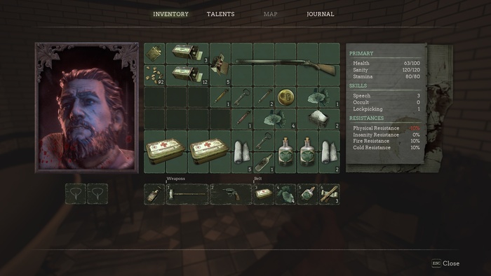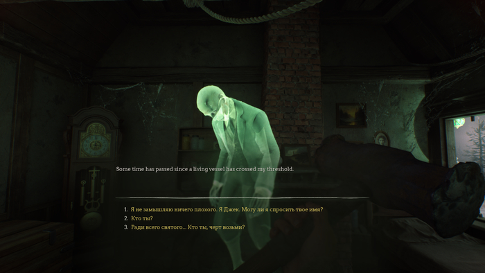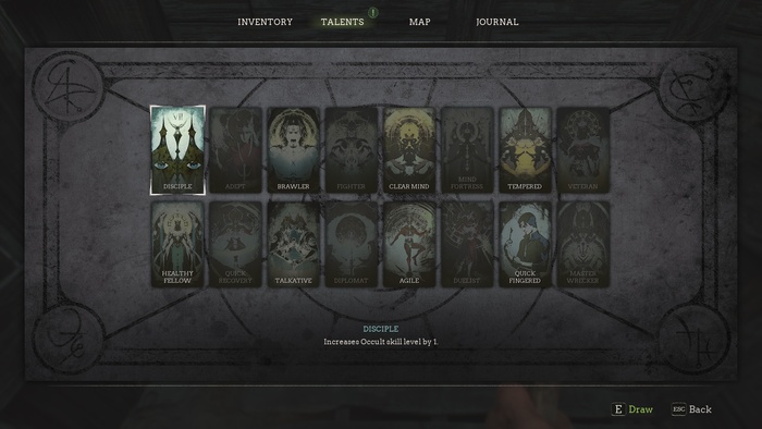 Уникальности прохождению могут придать специальные навыки, которые раскрываются тут двумя типами карт. Сами карты, к сожалению, можно лишь найти или получить при выполнении квестов в качестве награды, системы накопления опыта в игре нет. Самих способностей тоже мало, зато нет ничего лишнего – улучшение урона, физического здоровья, психической устойчивости, выносливости, взлом замков, познания в эзотерике. Это всё улучшается в два уровня одним типом карт. Другой тип карт даёт специальные навыки, типа общения с мёртвыми или способность передвигаться абсолютно бесшумно. Несмотря на скудные варианты прокачки, они могут изменить процесс кардинально. Я, например, качал урон, здоровье и убеждение, а также взял навык, позволяющий поднимать особо тяжёлые предметы – как правило, тяжести загораживают проходы к тайникам или альтернативным путям прохождения. Из-за своей эзотерической тупости я ничего не мог сделать с найденными тотемами, а отсутствие навыка взлома не дало мне вскрыть некоторые двери и сундуки. Ещё я прокачал убеждение – персонажей, с которыми можно перекинуться добрым словом, в игре немного, но разговорные навыки позволяют раскрывать новые ветви прохождения и получать дополнительную информацию.