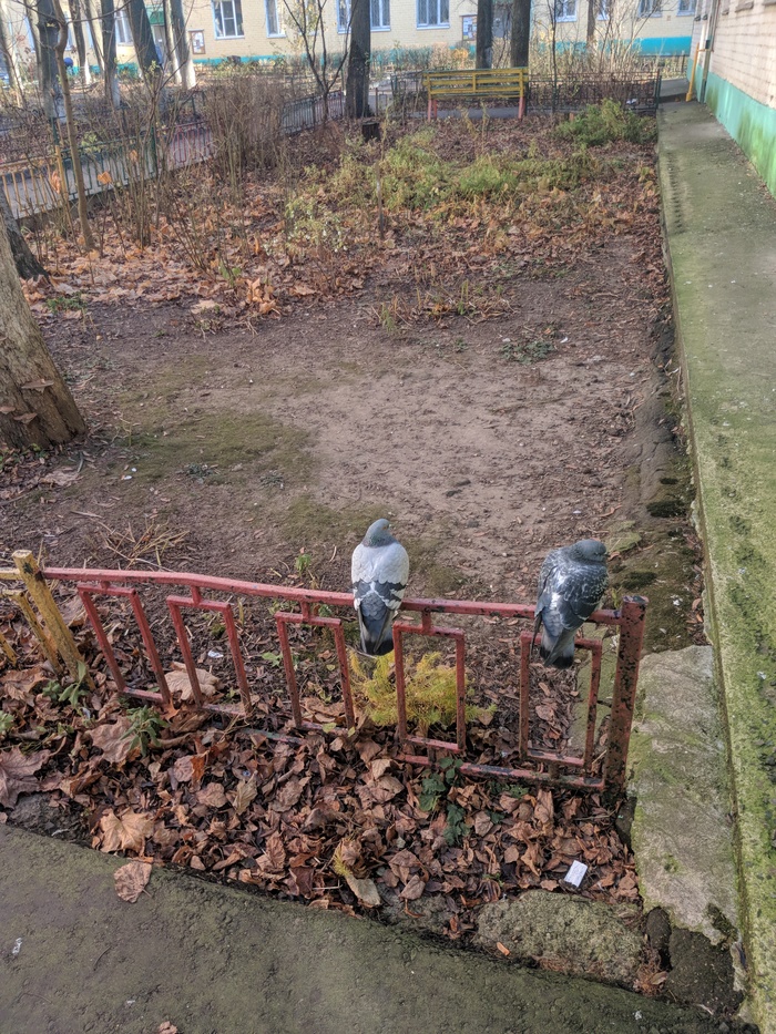 Выходим из дома. Солнечный день, теневая сторона здания. Фокус на левом голубе.