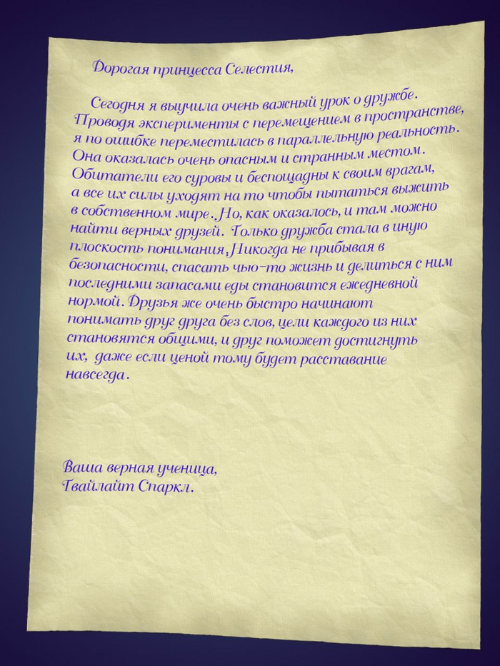 -И того: тебя звать Твайлайт, ты изучаешь магию дружбы, попала сюда по ошибке в эксперименте с порталами, и тебе нужен любой портал, чтобы преобразовать его и вернуться домой, все правильно?