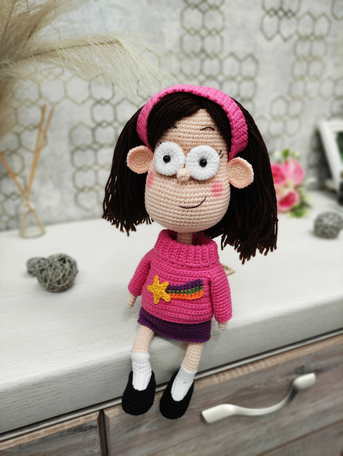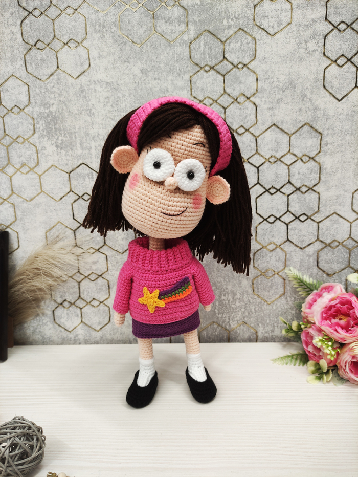 Высота куклы 30.5 см. Волосы из пряжи шерсть+акрил, все остальное хлопок+акрил. Наполнитель синтепух.