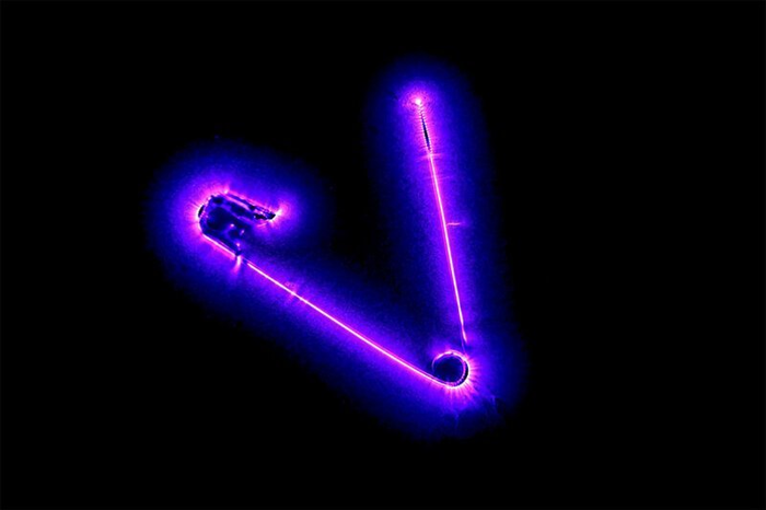 На английскую булавку подан ток высокого напряжения, и она генерирует ионизирующее излучение.