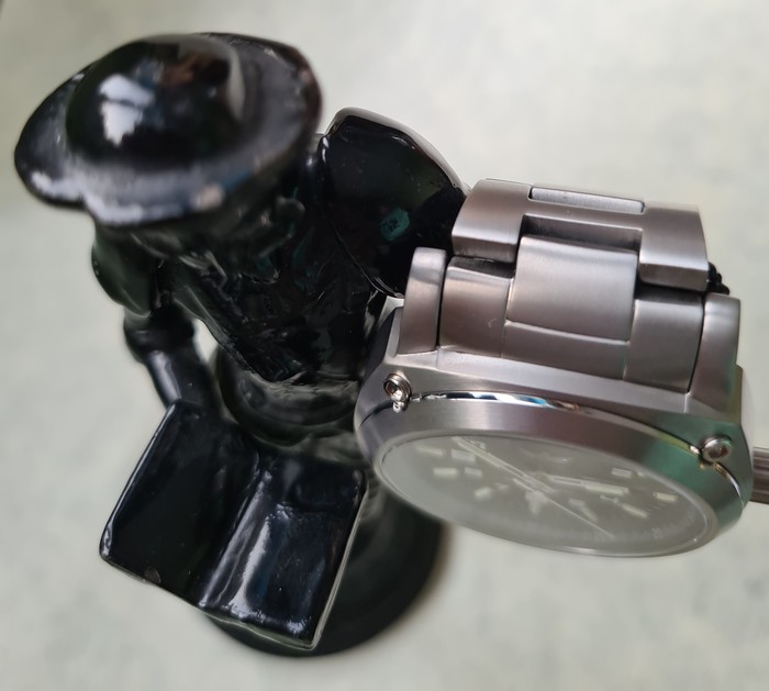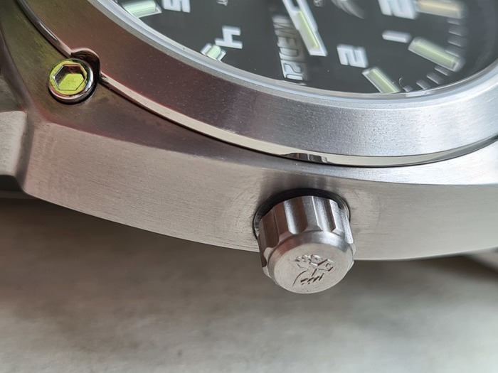 6. Заводная головка на резьбе. Могла бы быть и побольше, КМК. Эмблема фирмы встает в произвольной ориентации - мне пофиг, но есть люди, которые оргазмируют на факт, если рисунок на коронке ориентирован "как положено", поэтому отдельно отмечаю этот факт. Выделяется полированная вертикальная грань безеля, смотрится круто и очень оживляет часики: