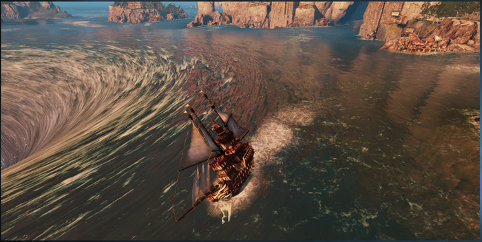 Корабль можно только ускорять и замедлять, но дать полноценный задний ход, могут только дварфы, ведь их естество отрицает существование парусов, потому что паруса для пидоров. Остальным же резко остановиться не получиться, поскольку ветер гонит нас по волнам, а инерция делает свое дело. Если вы решите резко затормозить или изменить направление, то вам придется замедляться и разворачиваться всем, мать его, корпусом. И можете не сомневаться, что потоки воды в этой игре сыграют в этом деле свою лепту, да так, что вы либо разъебете пол корабля о рифы, либо кто-то разъебет вас тараном, пока вы будете гнаться за гребаным лутом, который течение уносит тоже!