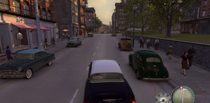 Как уже говорилось выше, прототипами Эмпайер-Бэй стали реальные американские города. Учитывая охватываемый сюжетом игры период, нужно отметить, что вторая половина 1940-х годов для Америки стали очень плодовитыми. Это объясняется ее довольно выгодным положением во время Второй мировой войны, в ходе которой США смогли поднять экономику, пострадавшую во время «Великой депрессии» 1930-х годов. Города Нью-Йорк и Лос-Анджелес пестрили обилием вывесок, огней. На улицах города было, что называется «не протолкнуться» - толпы людей, высокий автомобильный трафик (рис. 5). Что мы видим в игре? Город, отличающийся масштабной архитектурной застройкой, многоквартирные дома, бары, самые различные места отдыха. Но для кого это все? Людей, как и машин, присутствует в игре сравнительно мало для такого города и периода. Трафик на дорогах позволяет беспрепятственно превышать скорость (что, конечно же, наказуемо), люди неспешно прогуливаются по улицам, будто в небольшом городке на окраине, где никто никуда не торопится (рис. 6). Это довольно резко бросается в глаза, как будто все труды заканчиваются на восхитительно детализированных двориках и зданиях, машинах, где все 37 заявленных моделей вызывают восторг. Жители города часто похожи друг на друга, их ритм жизни визуализированный в игре оставляет привкус легкой прогулки, совершенной от лица мафиози.