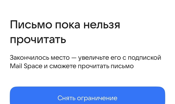 Ну и самый сок! Естественно, чтобы открыть письмо и начать пользоваться почтой мне надо «снять ограничение» КУПИВ эти самые гигибайты.